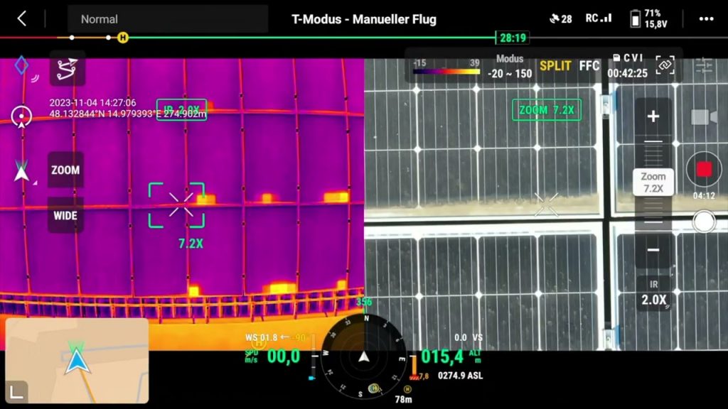 • Frühzeitige Fehlererkennung: Durch regelmäßige Inspektionen können potenzielle Probleme wie defekte Module, beschädigte Verkabelungen oder Hot-Spots schnell identifiziert werden, bevor sie zu größeren Schäden führen. / Kartierung
